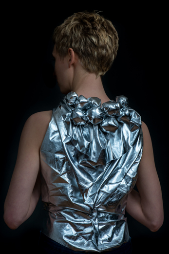 Tiffany Rowe’s recent art project revolves around the question of what happens when one observes a stranger – what preconceived ideas, fantasies and images do we project onto that person? Recently, Tiffany observed a lady seated in a restaurant, her short, cropped hair revealing her shoulders and graceful neckline. Tiffany decided to invite her to pose for a series of photos, yet she knew absolutely nothing about her future model. She asked the young woman simply to be seated as she was in the café and to wear a succession of jewellery pieces - each accessory representing a part of the designer’s personality and experiences; thus one of the many perceptions she may have had. Who is she? What does she do? What is she waiting for? Is she scientific, artistic or even fanciful? On looking closely at Tiffany’s jewellery creations we can begin to guess what each one represents - a necklace made with small boxes that initially held microscope glass slides is an allusion to Tiffany’s studies in biology. Jigsaw puzzle pieces and toys are probably references to her childhood, the cloud necklace a hint to Magritte and a surreal art world… Tiffany lets you imagine the rest. Une femme assise sur un tabouret, seule dans un café, de dos, les cheveux courts et la nuque dégagée. Qui est-elle? Que fait-elle? Qu’est ce qu’elle attend? Autant de questions sans réponses que de fantasmes imaginés et projetés sur ce joli canevas qu’est le dos d’une femme anonyme. Photographer: Robert Hradil, assistant: Monika Majer, model: Evelyne |