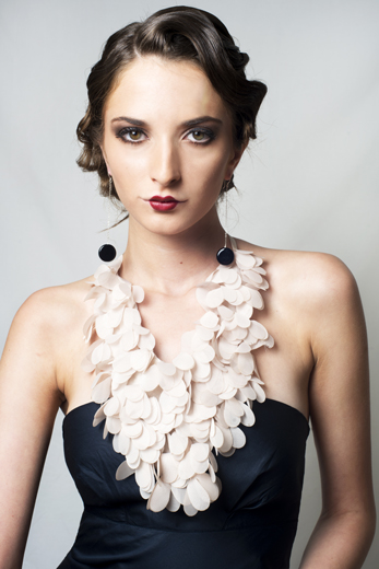Silent movies This collection is all about by the feminine glamour of the actresses staring in 1930's silent films. Delicate ruffle necklaces are complimented by the graphic lines of art nouveau inspired earrings. A hint of the orient and its influence during this period is given by using hand sewn tassels that are magically transformed into elegant pendants. Cream, prune, mocha and black make up the subltle colour theme. Fascinée par le cinéma muet des années 20, par la grâce et la distinction des actrices des « silver screens », Tiffany Rowe a imaginé une collection avec comme mots d’ordre la féminité et le silence. Réalisée en grande partie sans métaux, ces parures qui ne font pas de bruit sont élégantes et raffinées. Pendant les années 50, la mode est influencée par la Chine – les longues robes à col mao et les histoires de Suzie Wong ont également captivé l’imagination de Tiffany Rowe. En incorporant dans cette collection des nœuds, des pampilles et de la passementerie en cordage noir, la créatrice fait un clin d’œil aux porte-bonheurs orientaux. Ces colliers sensuels ont la particularité de pouvoir se porter dans le dos. Franges et rubans viennent donc caresser le creux des reins, de leur douceur de soie.
